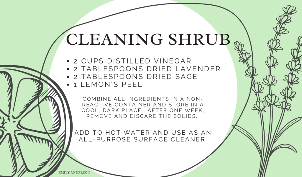A cleaning shrub is the simplest kind of shrub to make. All you have to do is add about ¼ cup of dried herbs, flower petals, or citrus peel to 2 cups of distilled vinegar and let it sit for a week. Strain out the solids and you have an all-natural cleaner that smells great!