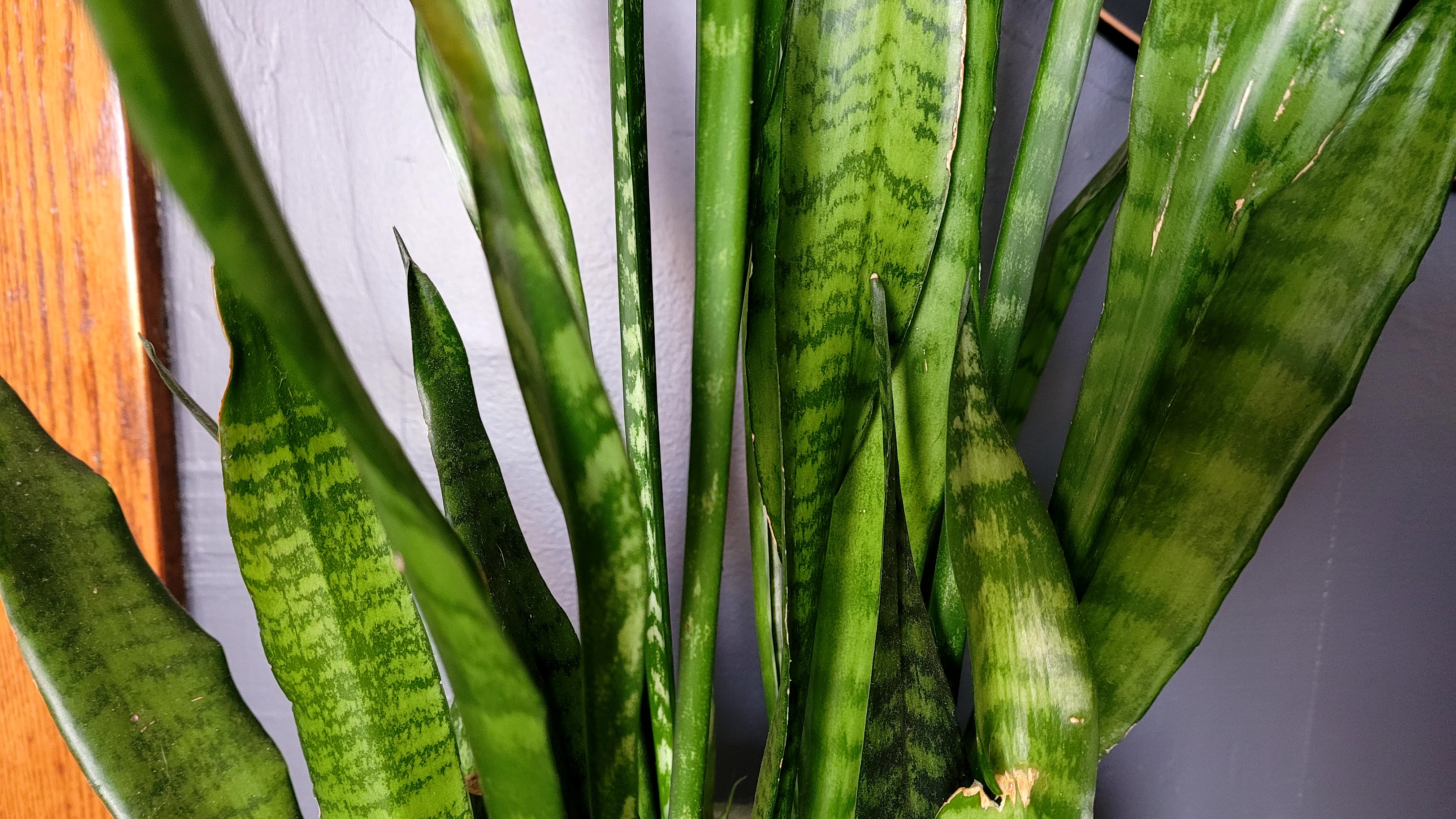 There are more than 70 different species of Snake Plants, but they’re not all commonly utilized as houseplants. The most common domesticated cultivar is Dracaena trifasciata, which grows broad blades up towards the sky. Another popular cultivator is cylindrica, which grows in – you guessed it – cylinder-shaped spikes. Dwarf varieties grow in a rosette shape close to the ground. They all come in many colors, from the yellow golden hahnii and baby blue moonshine, to the deep emerald fischeri and striped cleopatra. My personal favorite is the Whale Fin, or masoniana, which grows as one huge blue-gray leaf pointing straight up.